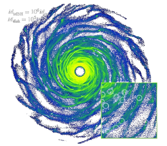 I am currently coordinating one of the first Astro Working Group collaborative projects on a simulation comparison for black hole binary evolution in accretion disks. Here is an example of the surface density of an accretion disk with an embedded perturber, obtained from a 2-dimensional simulation using DISCO. As the BH orbits it perturbs the gas on many scales, and resolving these perturbations is important for determining its orbital evolution. Not all simulations find the same results, so it is critical to compare our techniques to better understand the tools we use to predicdt the fate of this system: will the binary shrink to the scale where it becomes a powerful gravitational wave source? If so, what will its orbital properties be? Can the gas dynamics produce informative electromagnetic or graviational wave signatures? This work is motivated by black hole binaries that we expect LISA to detect, but it is also applicable to studies of planetary migration, where the same process occurs but at a different scale.